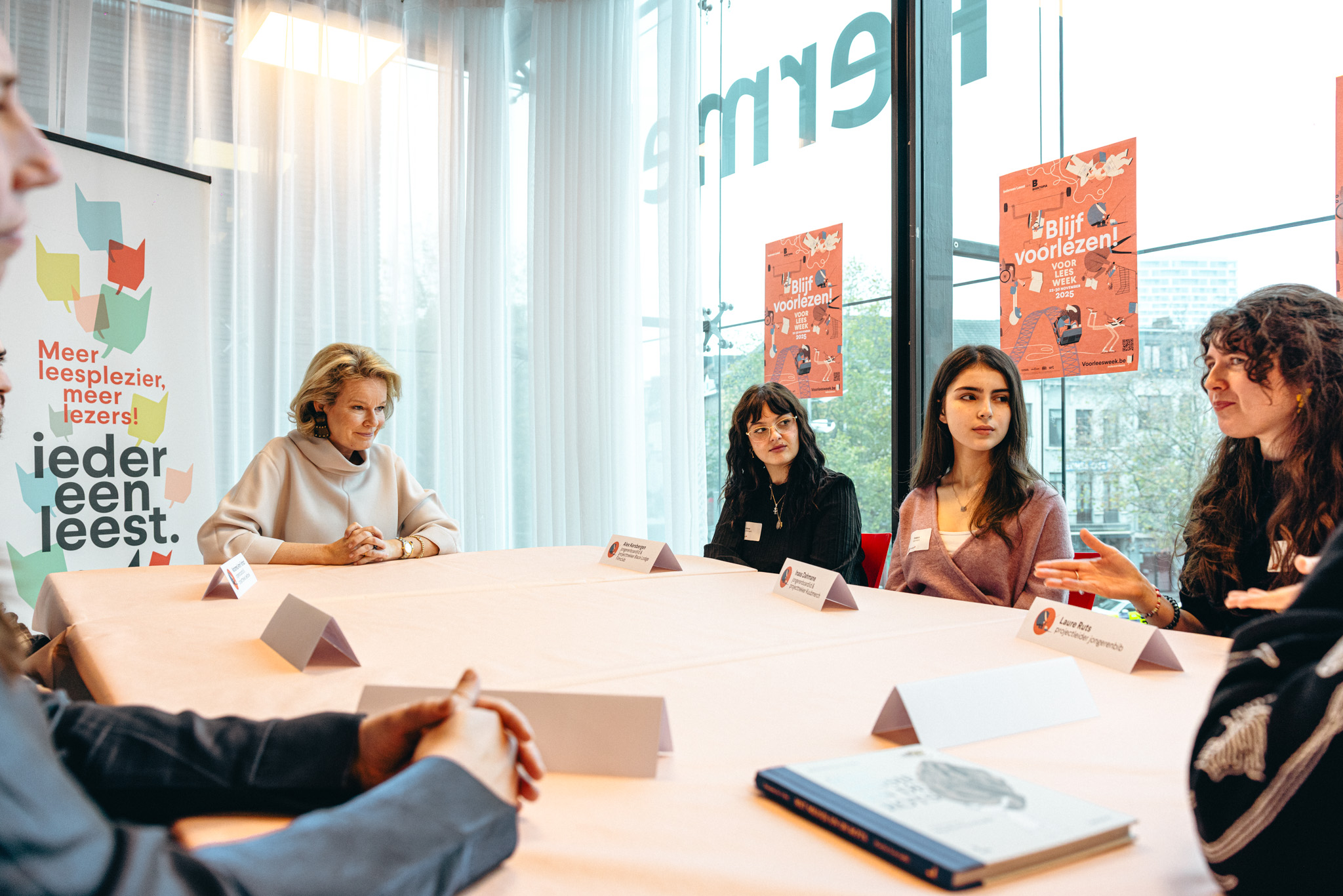 Koningin Mathilde las voor aan jongeren in jongerenbib kubus in Antwerpen, een initiatief van Bibliotheek Permeke. Die plek is niet toevallig gekozen: het is een manier om dit mooie project in de kijker te zetten.