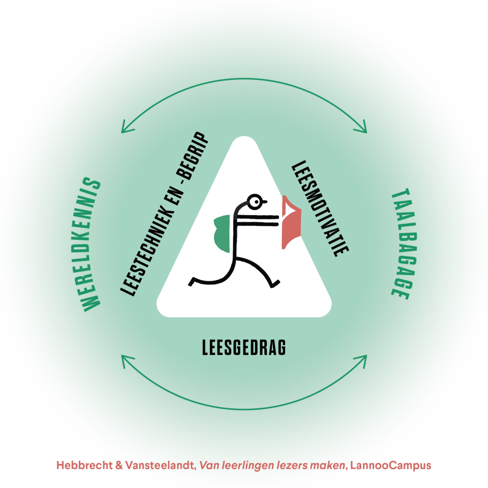 Zoomen we in op wat iemand tot lezer maakt, dan duiken er enkele kernaspecten op. In hun boek Van leerlingen lezers maken schetsen Jona Hebbrecht en Iris Vansteelandt die aspecten in een leesdriehoek (zie figuur). Leesmotivatie, leesgedrag en leesvaardigheid (techniek en begrip) komen er prominent in beeld. Deze aspecten zijn met elkaar verbonden: ze spelen op elkaar in en kunnen elkaar versterken. Wie goed leest, leest liever en omgekeerd. Zo ontstaat er een positieve leesspiraal. Ook de omgekeerde beweging geldt: wie niet gemotiveerd is om te lezen, gaat minder frequent lezen en oefent daardoor geen leesvaardigheden.