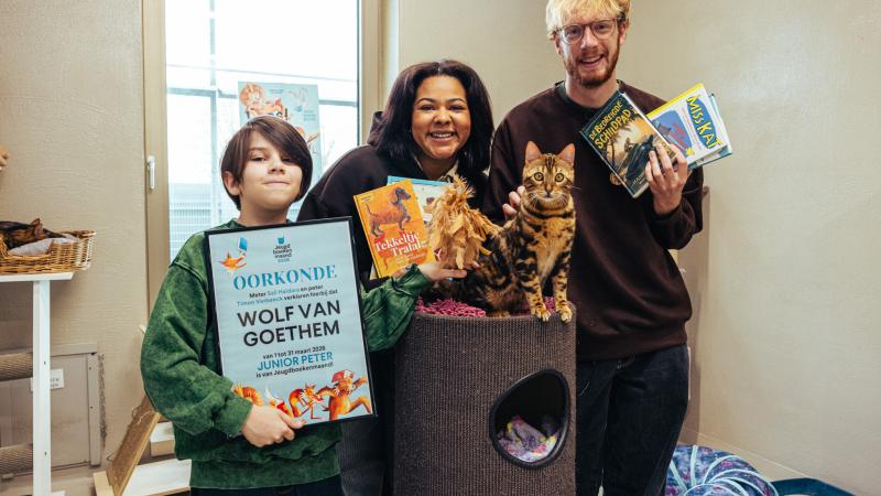 Jeugdboekenmaand heeft een nieuwe junior peter: Wolf Van Goethem! Zijn filmpje werd door KETNET en Iedereen Leest gekozen uit meer dan 120 inzendingen. Peter Timon Verbeeck en meter Sali Haidara stelden hem voor bij de lancering van Jeugdboekenmaand in het Dierenasiel van Gent, waar ze samen gingen voorlezen aan katten.