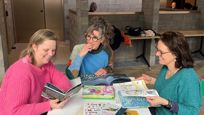 Collega's Margot, Griet en Geertje overleggen over het webinar.