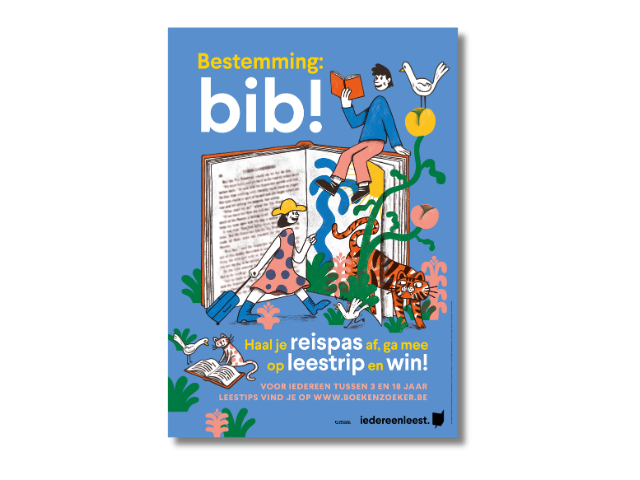 Bestemming: bib is de zomerleesactie van Iedereen Leest voor bibliotheken. Tijdens de zomervakantie kan iedereen tussen 3 en 18 jaar een reispas halen in een deelnemende bib. Wie meeleest, maakt kans op een reiskoffer vol boeken! Op deze pagina vind je alle info over de actie. In 2026 is er opnieuw een editie van Bestemming: bib, met verse look en nieuwe thema's.