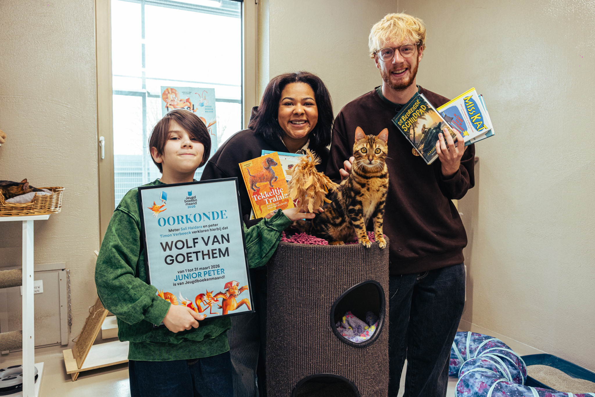 Jeugdboekenmaand heeft een nieuwe junior peter: Wolf Van Goethem! Zijn filmpje werd door KETNET en Iedereen Leest gekozen uit meer dan 120 inzendingen. Peter Timon Verbeeck en meter Sali Haidara stelden hem voor bij de lancering van Jeugdboekenmaand in het Dierenasiel van Gent, waar ze samen gingen voorlezen aan katten.
