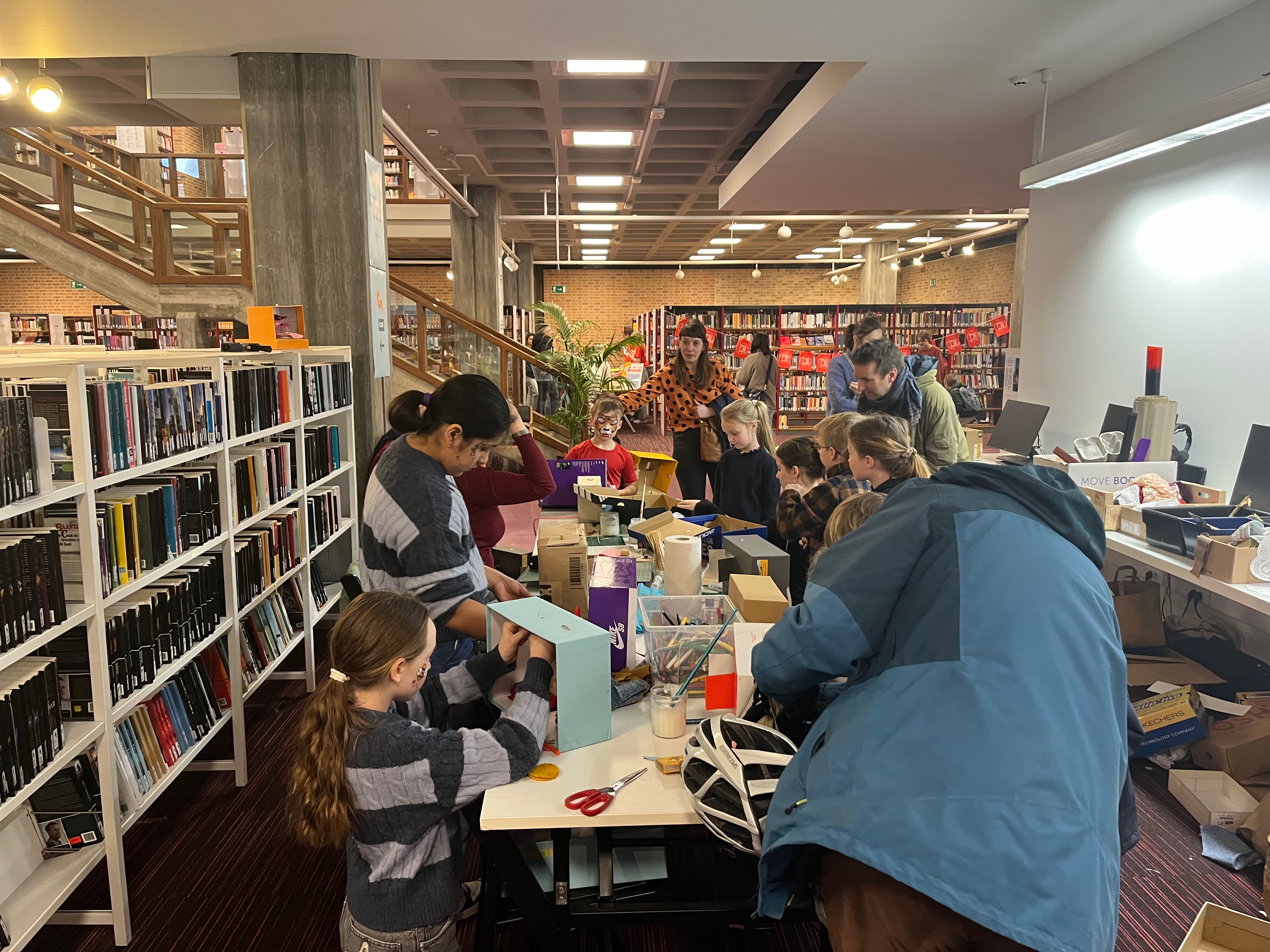 Wie tijdens Jeugdboekenmaand een bib binnenstapte, kon er niet naast kijken: overal doken kunstwerken in dierenthema op. Onder het motto ‘Lees! Brul! Grom!’ toverden kunstacademies bibliotheken om tot levendige dierenwerelden. In de bib van Lommel kregen de creaties van de Kunstacademie Noord-Limburg een plek tussen de boeken. ‘We verwelkomden ook dagelijks klassen voor voorleesmomenten en speelse opdrachten’, zegt medewerker Tinne Mertens. ‘En elke woensdag lazen vrijwilligers voor in onze vertelkuil, omringd door knuffels en handpoppen.’ De maand sloot af met een drukbezocht slotfeest met ateliers, een poëtisch postkantoor en een barista. ‘De bib is een kruispunt, zeker dan. Het is elk jaar onze drukste dag. Heel Lommel is dan hier!’