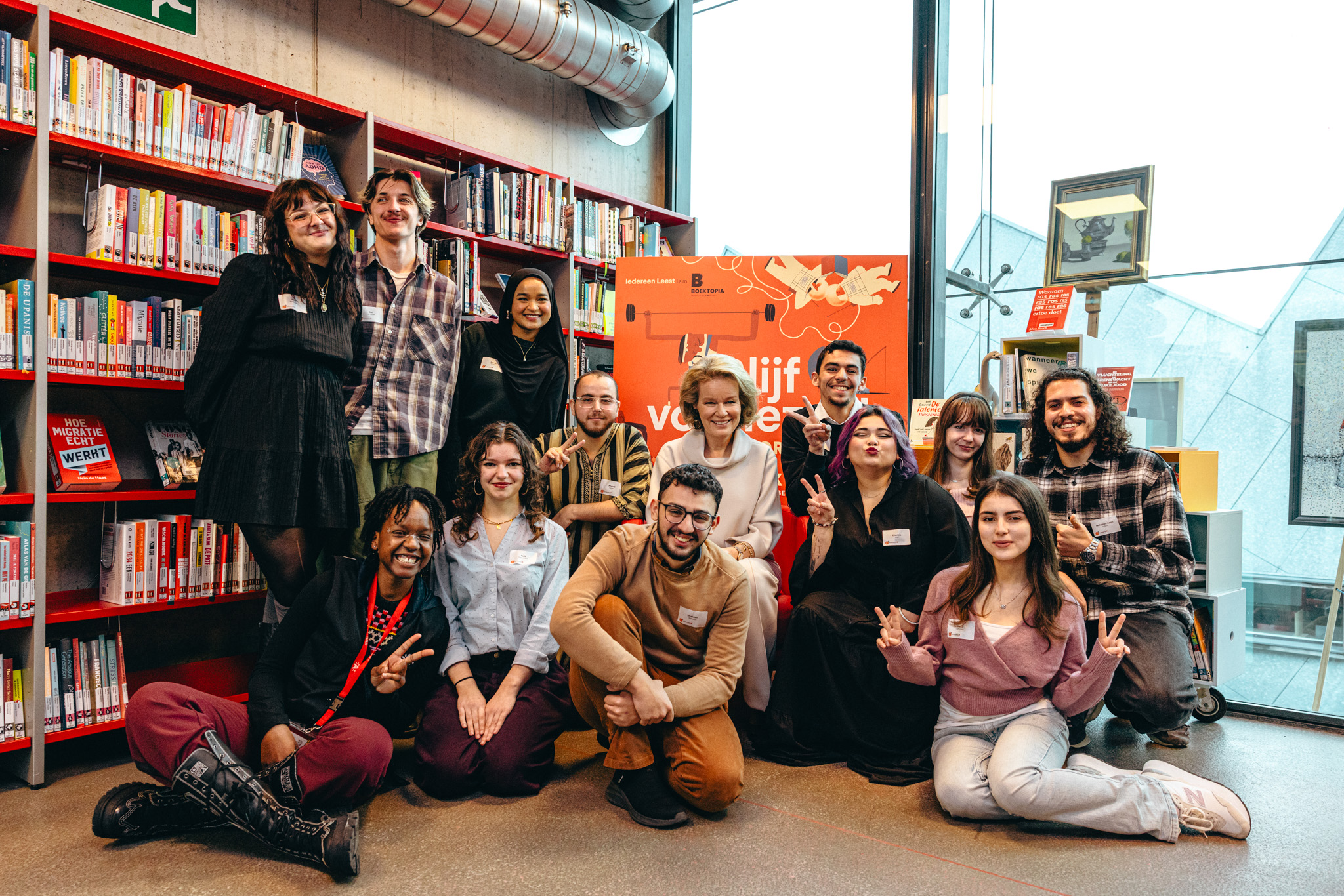 Koningin Mathilde las voor aan jongeren in jongerenbib kubus in Antwerpen, een initiatief van Bibliotheek Permeke. Die plek is niet toevallig gekozen: het is een manier om dit mooie project in de kijker te zetten.