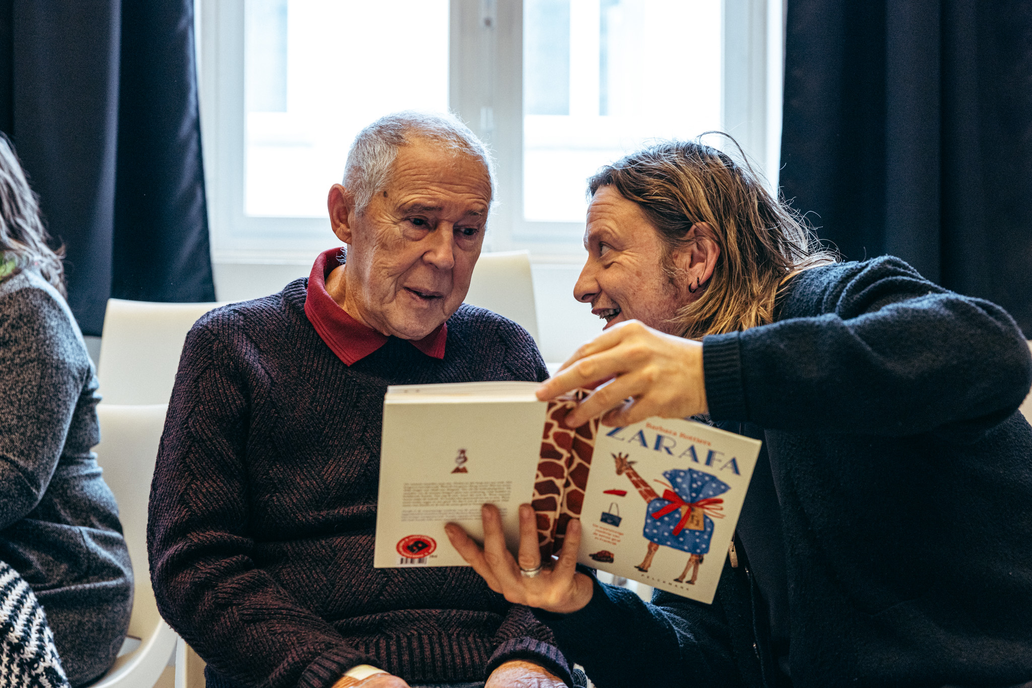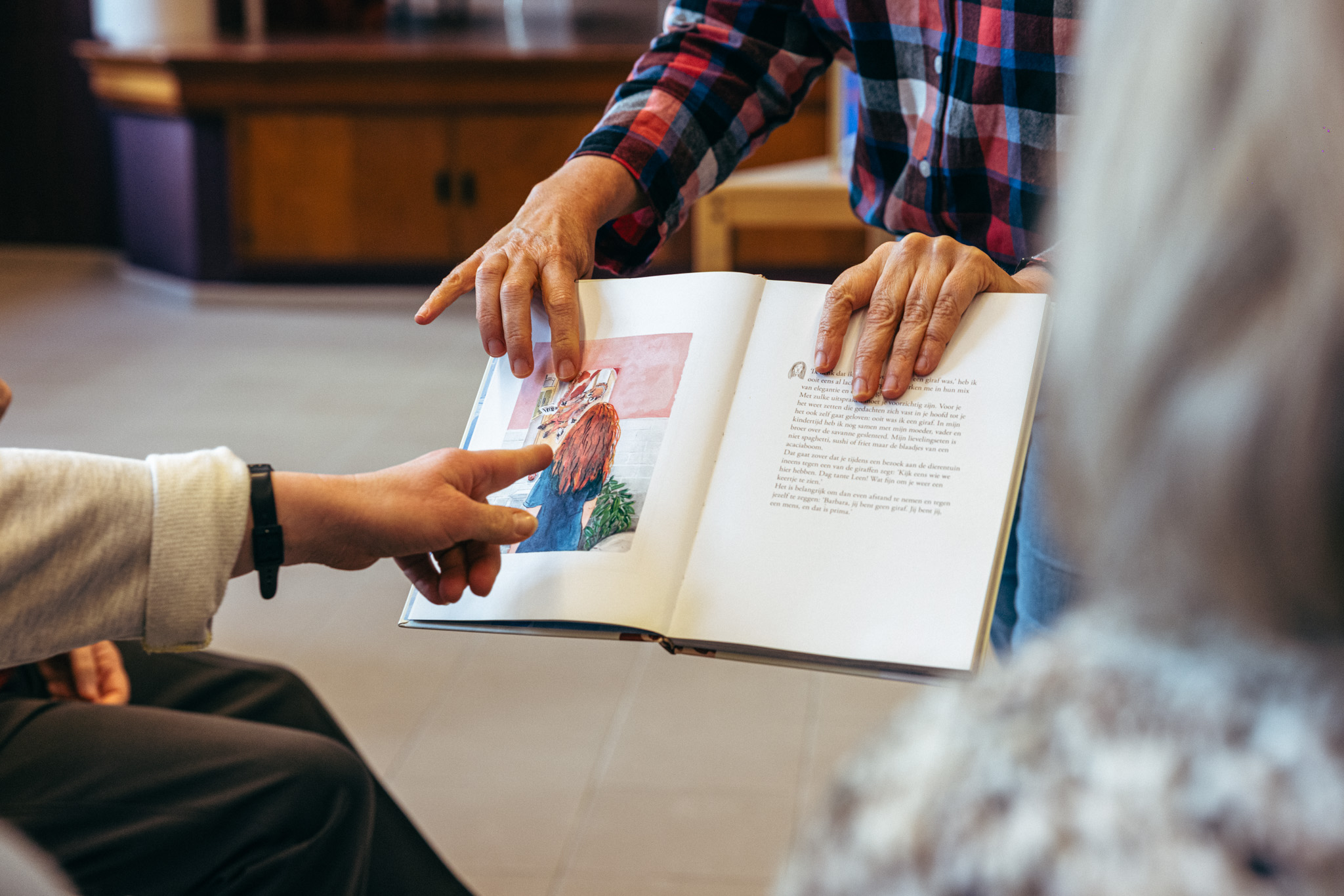 De rolstoelen staan al vroeg opgesteld in de woonwerking van Heder in Kalmthout. Sommige elektrisch, andere met een hoofdsteun, allemaal gericht naar dezelfde plek. Het is nog geen startuur, maar niemand wil iets missen. Er hangt een lichte spanning in de ruimte, niet omdat er iets moet, maar omdat er zo meteen iemand van buitenaf komt. Auteur en illustrator Barbara Rottiers legt haar jas over een stoel en wordt hartelijk verwelkomd. Ze vertelt waar ze werkt, hoe ze schrijft en tekent, hoe een boek langzaam ontstaat. Wanneer ze haar meest recente Zarafa aankondigt, probeert iemand de titel mee te lezen. ‘Safari’, klinkt het. Gelach. ‘Nee,’ zegt Barbara, ‘Zarafa. Dat is Arabisch voor giraf.’ Het woord wordt herhaald. Twee uur lang leeft de groep mee met het verhaal van de eerste giraf die tweehonderd jaar geleden naar Parijs reisde - per boot en te voet - als geschenk voor de Franse koning. De bewoners haken in op elkaars opmerkingen, voegen details toe, improviseren en corrigeren Barbara op een speelse manier.