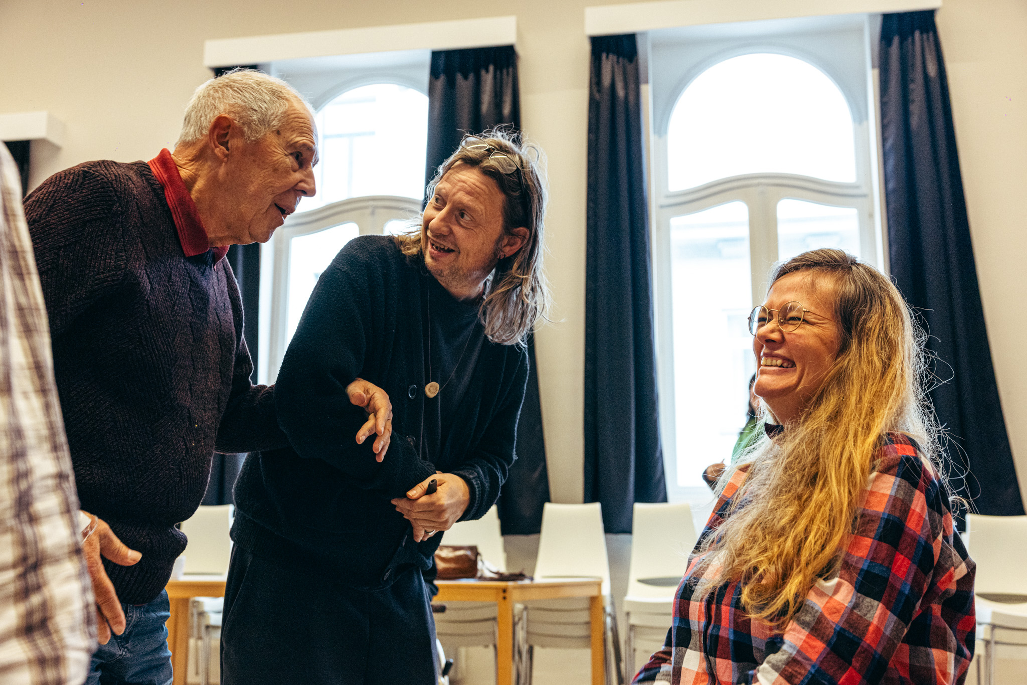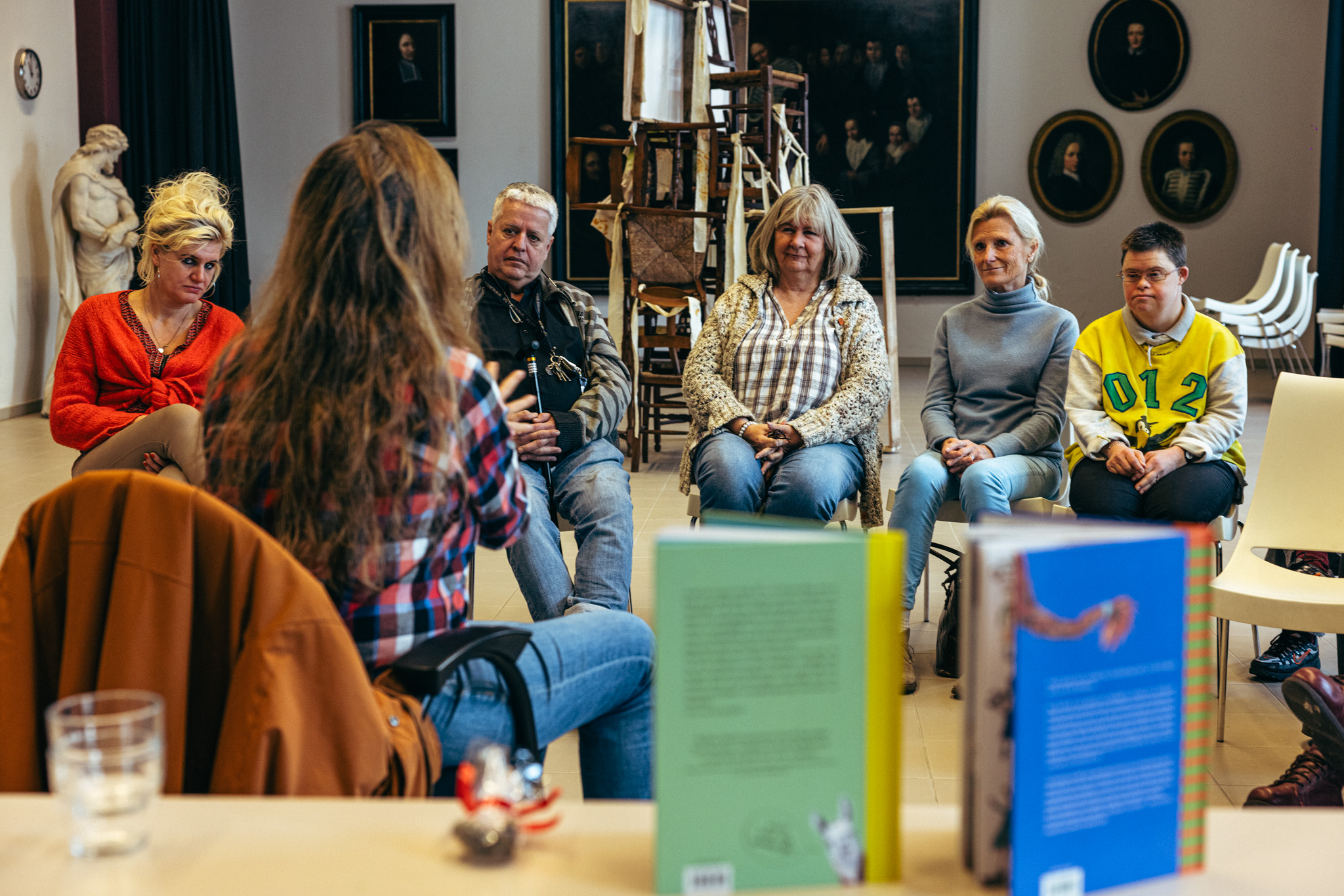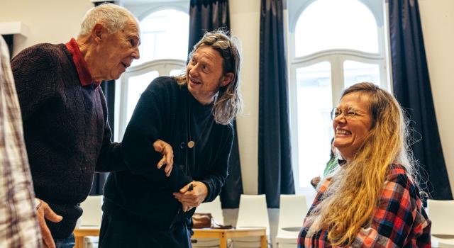 De sfeer in Kalmthout was uitgelaten, hier is die subtieler: de groep luistert stil en geconcentreerd, hun reacties zijn minder zichtbaar, maar zeker niet minder aanwezig. Barbara merkt op: ‘Het feit dat iemand van buitenaf hun wereld binnenkomt, is ontzettend waardevol. Ik zie het ook bij een vriend van mij: vroeger was het een stijlvolle man die veel in het buitenland verbleef, maar na een hersenletsel werd hij beperkt in zijn activiteiten. Samen met zijn vrouw blijft hij enorm van cultuur genieten en ze gaan vaak naar de film, maar verder is het aanbod voor zijn doelgroep zeer beperkt. Het is nochtans zo belangrijk.’ Karl kan het bevestigen. ‘Er is te weinig artistiek aanbod. In de zorg ligt de focus vaak op het lichaam en op zelfstandigheid: hoe meer iemand lichamelijk kan, hoe zelfstandiger die is. Dat is belangrijk, maar dan wordt iemand getraind om alleen te wonen en daar stopt het. Niemand vraagt: wat wil je met je leven doen? Daar zijn wij mee bezig. Hier gaat het erom dat je nog steeds cultuur, verbeelding en expressie kunt ervaren.’