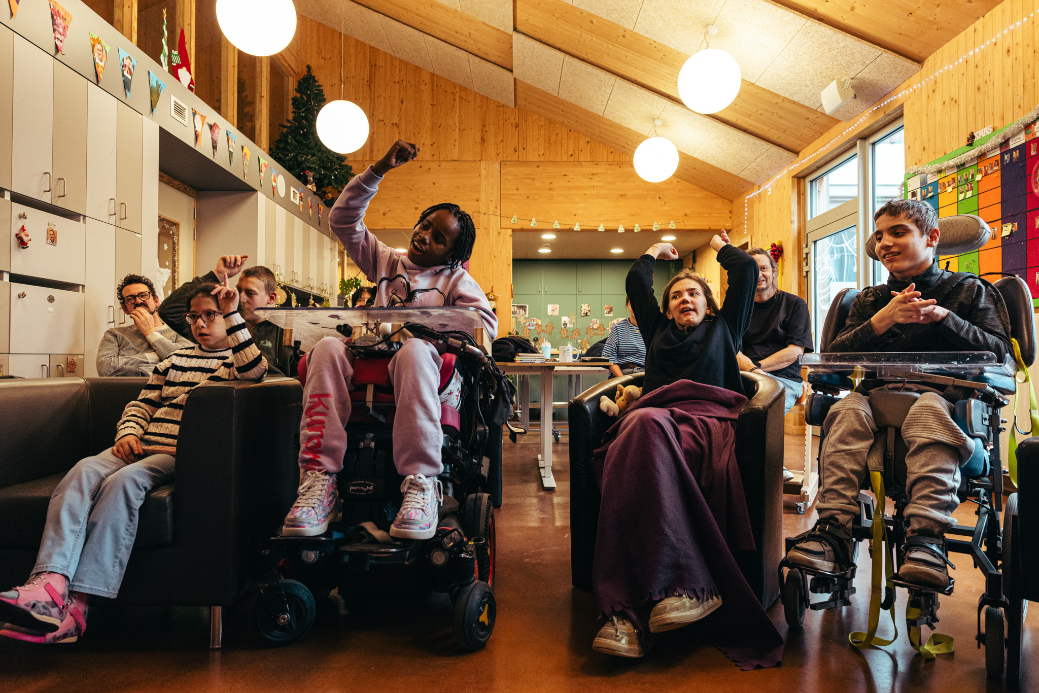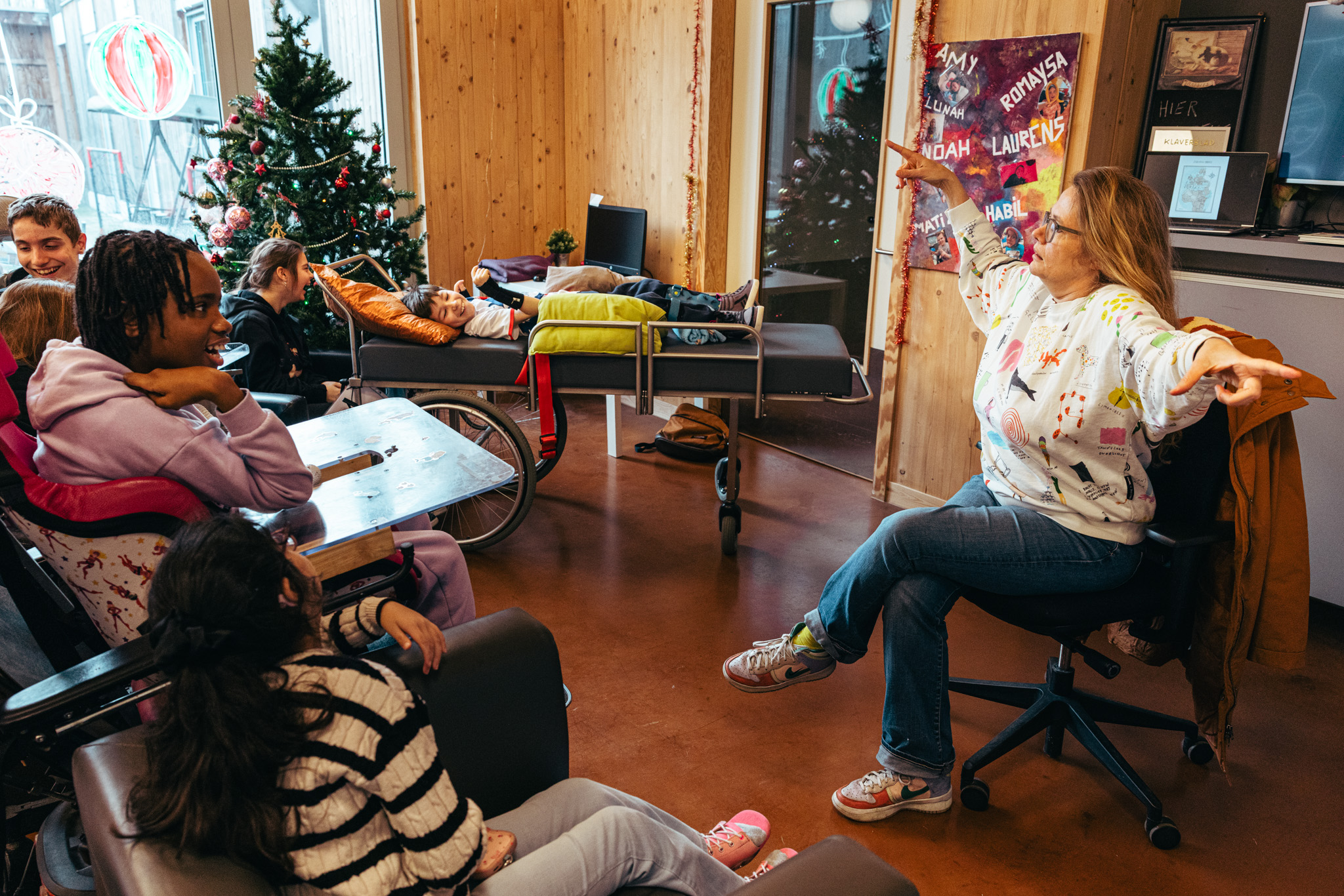 Op de derde locatie, Rozemaai in Ekeren, ontstaat opnieuw een andere dynamiek. Hier wonen kinderen en jongeren met motorische of mentale beperkingen. De groep is jong, nieuwsgierig en bruist van energie. Barbara vertelt over de tocht van giraf Zarafa en het gat dat in het scheepsdek moest worden gemaakt omdat ze bleef groeien. De kinderen reageren onmiddellijk: ‘Boten zijn niet voor giraffen!’ roept een jongen uit. Vragen volgen elkaar in snel tempo op, opmerkingen vliegen door de lucht. Barbara speelt mee met hun verbeelding en enthousiasme. ‘Van mij mag Barbara elk jaar komen’, zegt Karl aan het einde van de sessie. ‘Ja!’ roept iemand meteen uit. ‘Morgen?’