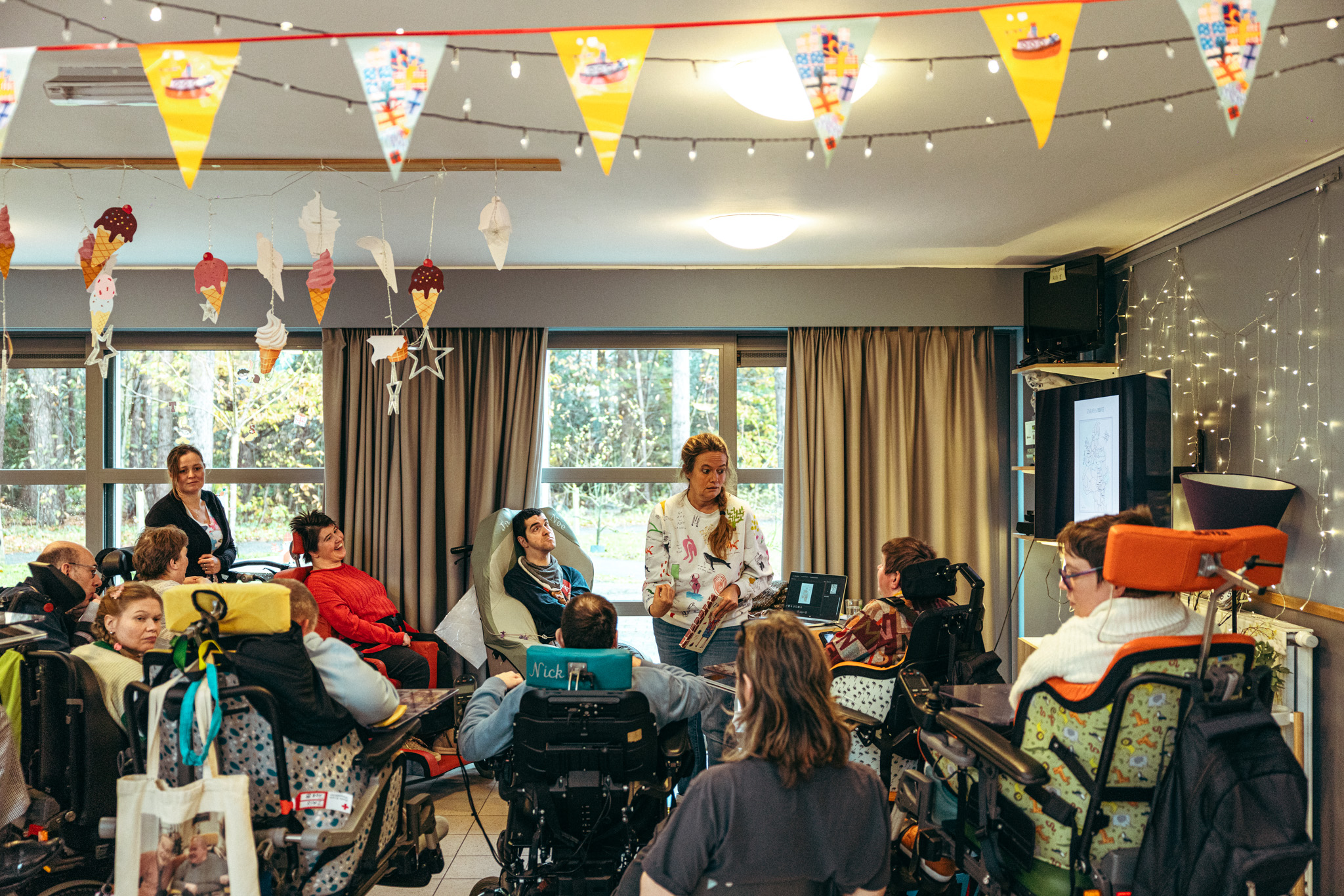 Het centrum in Kalmthout is een gezinsvervangende woonwerking waar volwassenen met meervoudige beperkingen wonen of deelnemen aan actviteiten van het dagcentrum. ‘Volgens de dossiers kunnen ze zich vijftien minuten concentreren’, zegt Karl Lardon, zingevingscoördinator bij Heder en bezieler van De Gele Duikboot. ‘Maar hier zie je: als iets hen raakt en boeit, dan blijven ze veel langer aandachtig.’ Voor deze volwassenen opent een verhaal een wereld van verbeelding, emotie en interactie. Ze leven in het nu en het bezoek van Barbara is een moment waarin ze volop aanwezig kunnen zijn en gehoord worden.