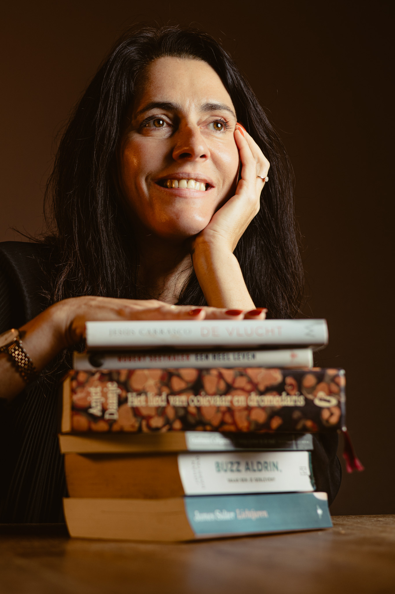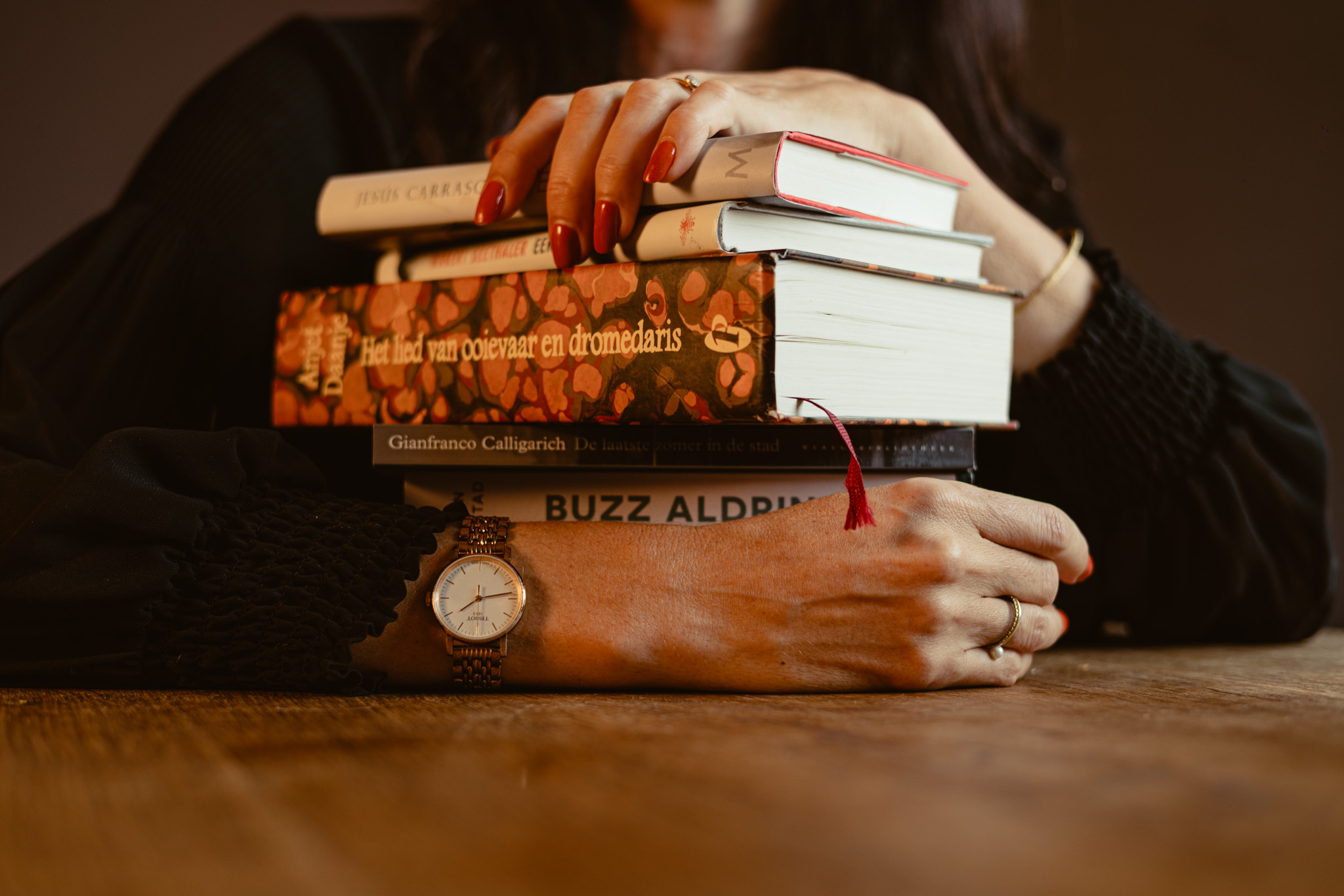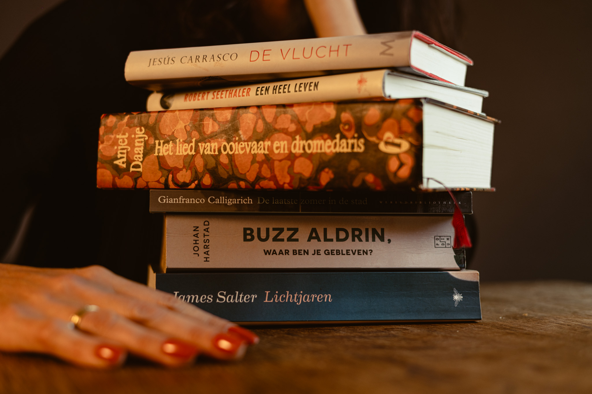 Robert Seethaler ligt op de tafel (Een heel leven), naast Gianfranco Calligarich (De laatste zomer in de stad), Dimitri Verhulst (Mevrouw Verona daalt de heuvel af) en James Salter (Lichtjaren). Allemaal mannen. ‘Ik houd van het mannelijke perspectief. Al staan Donna Tartt en Nino Haratischwili ook in de kast. Er zijn -vind ik- te weinig goede vrouwelijke hoofdpersonages. Daarom ligt Anjet Daanje bewust op tafel, omdat zij in Het lied van ooievaar en dromedaris er wel in slaagt om erg goede, vrouwelijke figuren neer te zetten. Je krijgt in dit boek tien verhalen, die bijna allemaal vrouwelijk getint zijn. Toen ik het las dacht ik: “Eindelijk.”’