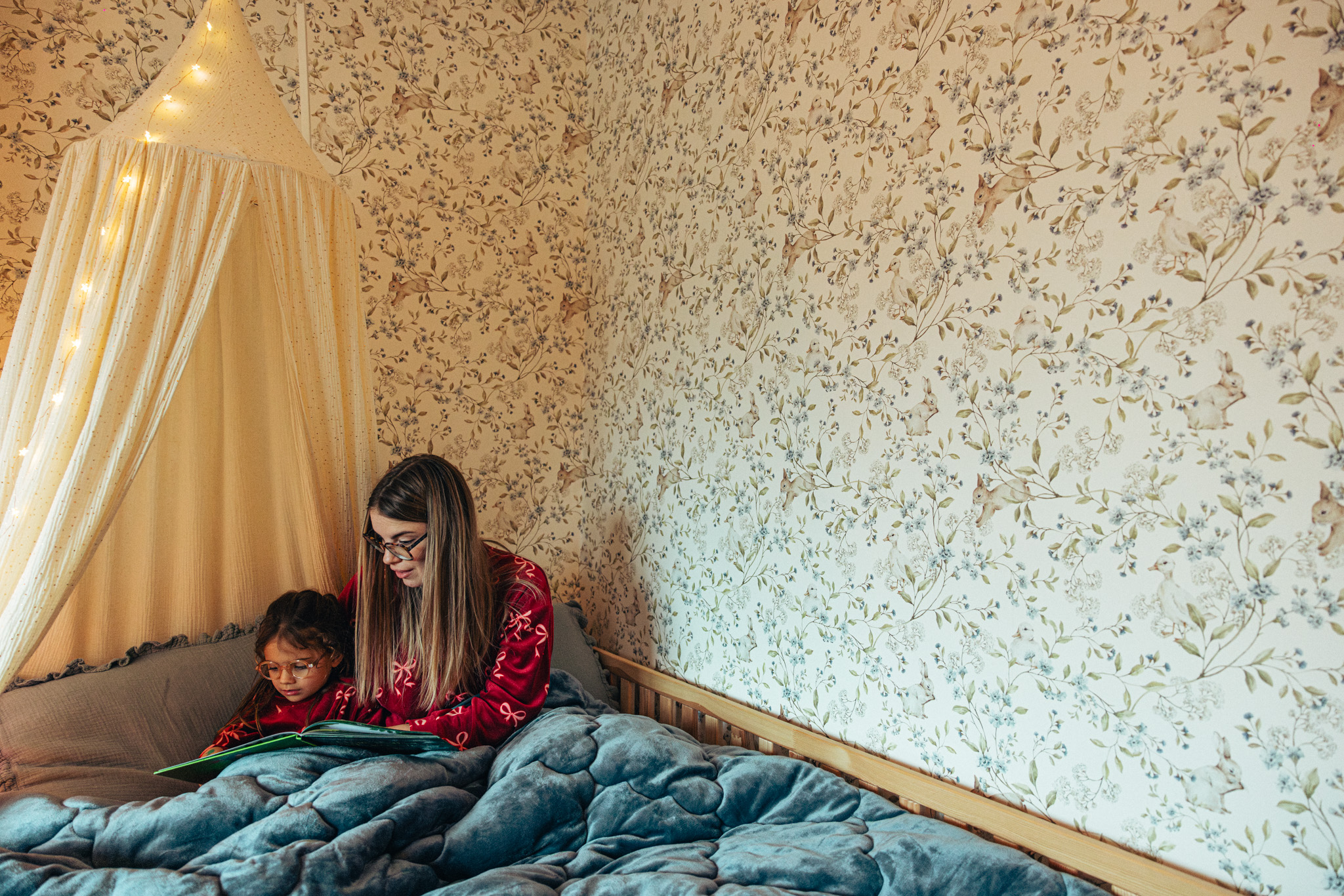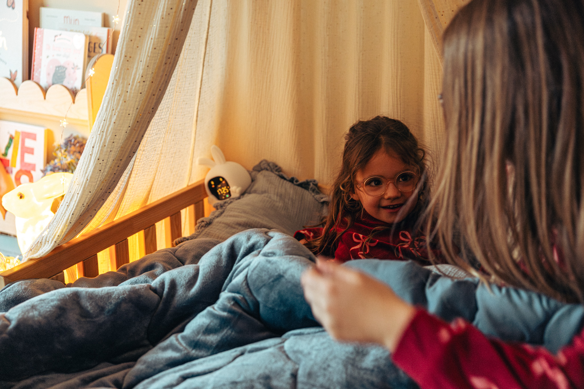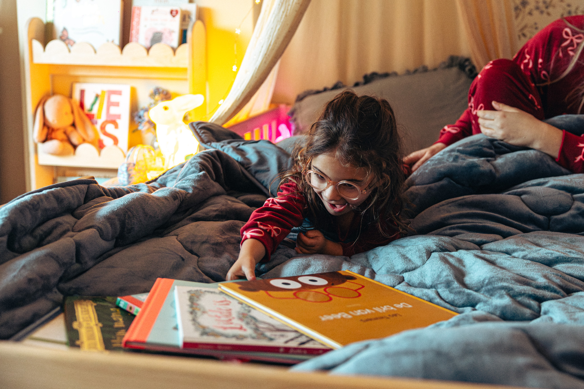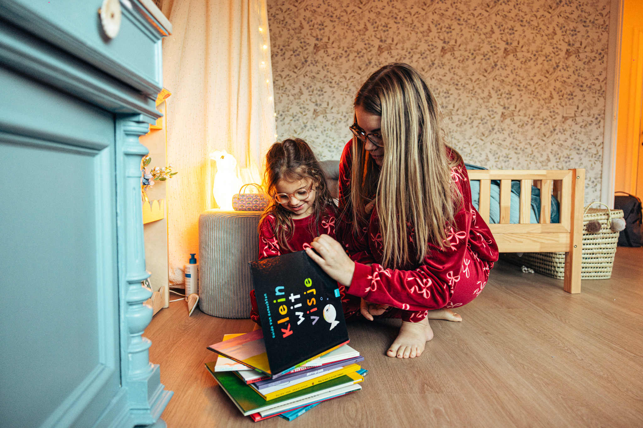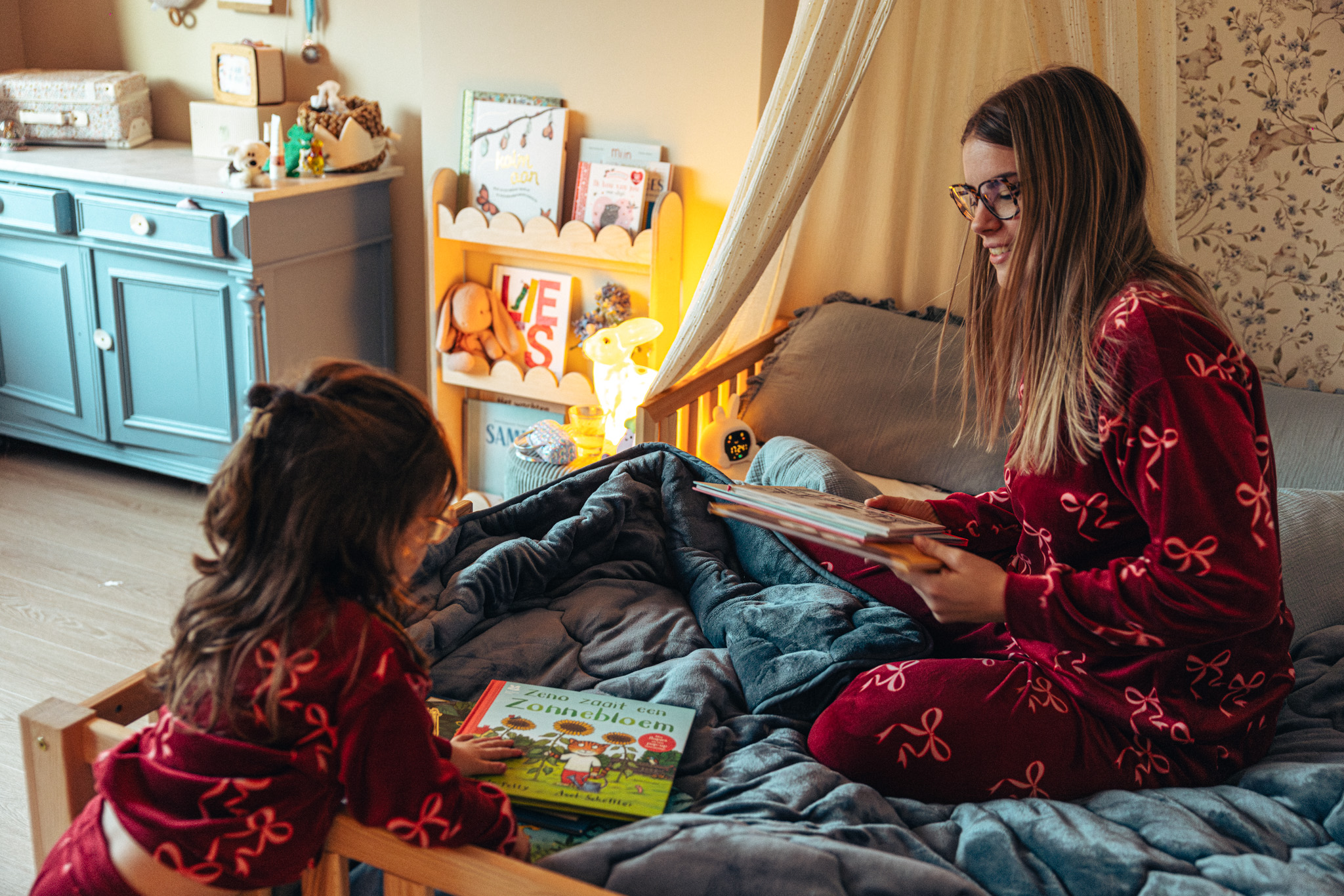 ‘Van kleins af lezen wij met Odette elke dag een verhaaltje voor het slapengaan, als deel van het bedtijdritueel. Eerst spelen we een spelletje, dan beginnen we met tandenpoetsen en trekken we haar pyjama aan. We sluiten af in bed met een verhaaltje, soms alleen Odette en ik, maar het gebeurt ook dat mijn vriend Pieter er gezellig bij komt. Met sfeerlichtjes maken we haar hemelbedje zo knus mogelijk. Meestal lezen we één boekje en praten we er nadien nog wat over na: wat is er gebeurd? Waarom zou dat zo zijn? Soms leggen we ook linken naar ons eigen leven.