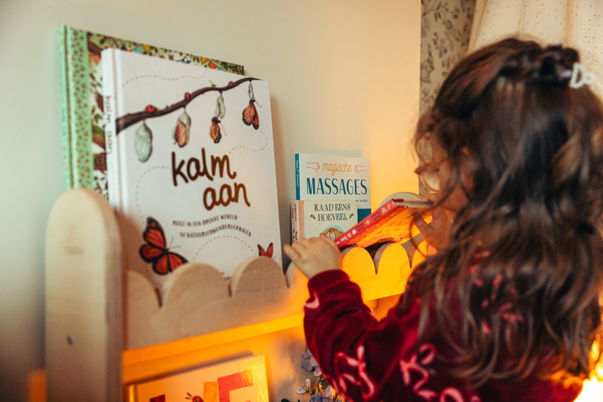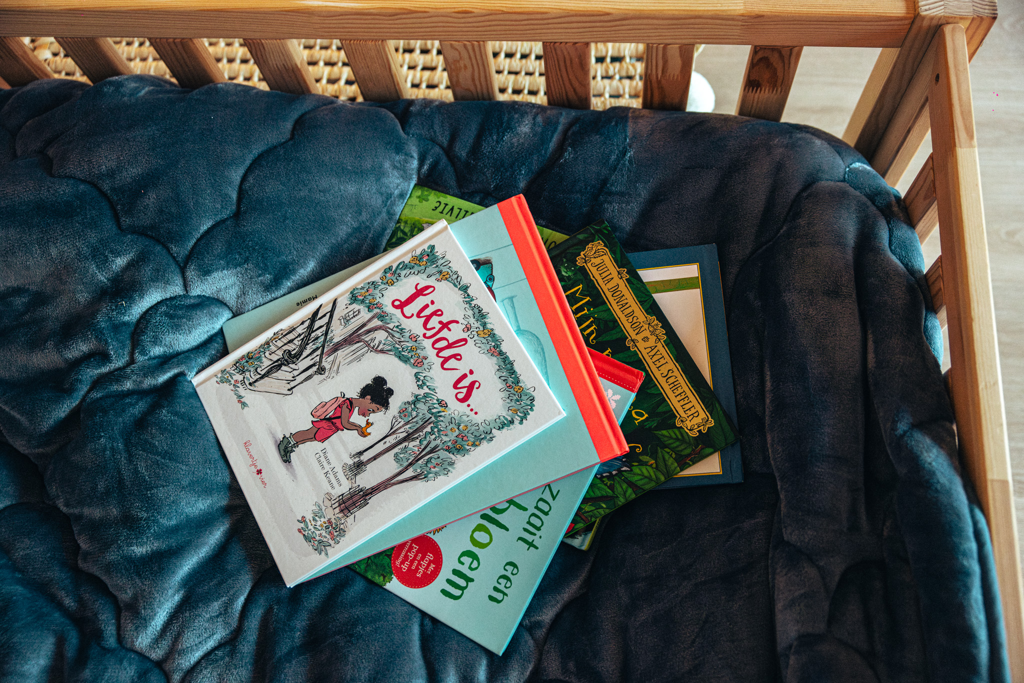 ‘Overal in huis staan er kinderboeken. Boeken die ik heel mooi vind of die me nauw aan het hart liggen, staan op het open rek in de living. Eén miljoen vlinders van Edward van de Vendel kreeg ik van Pieter bij het begin van onze relatie. Op Je bent al alles van Hanne Luyten heb ik, toen ik het voor het eerst las, erg emotioneel gereageerd. Ook Mijn mama is ook een mens van Madelon Lutgert-Plante staat op dat rek. De mooie cover past zelfs in het interieur.’