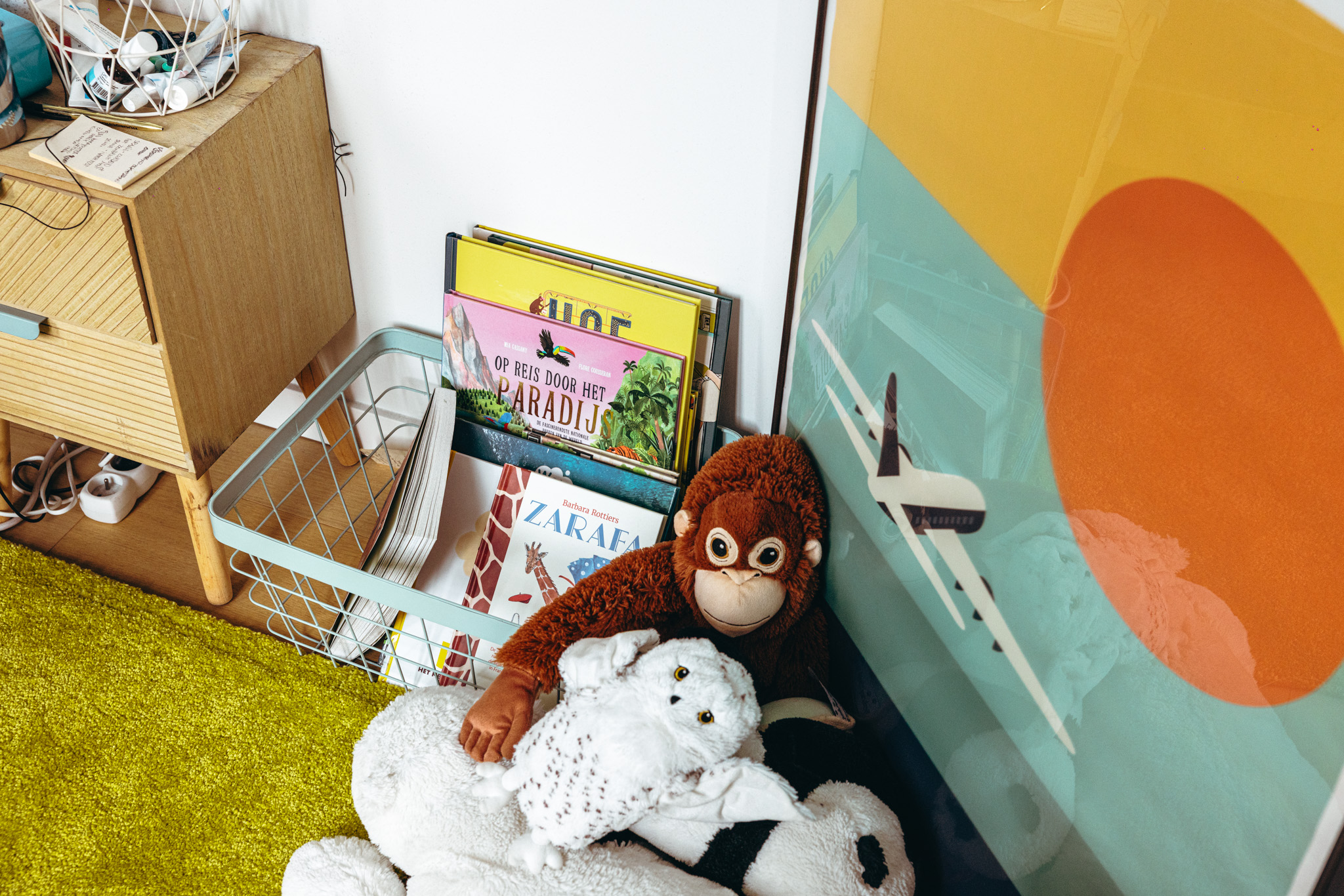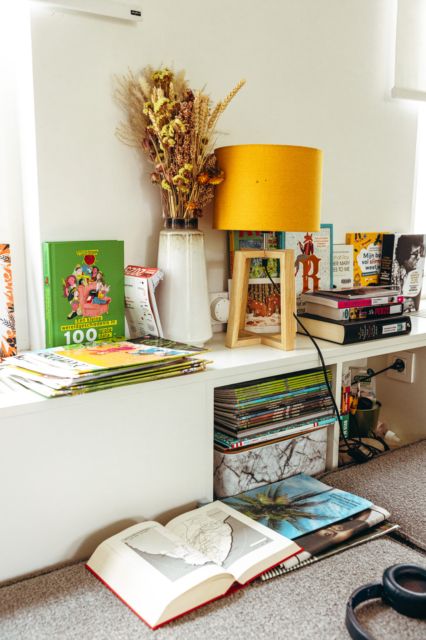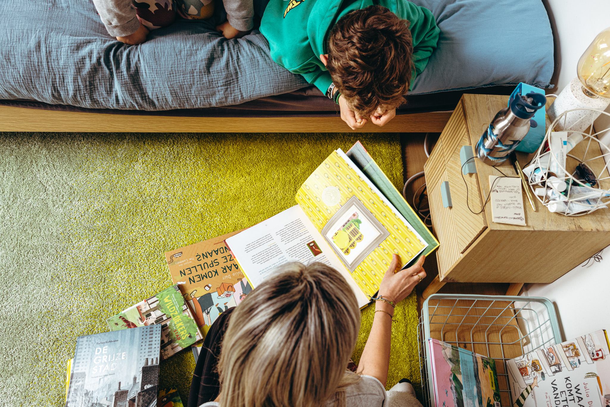 ‘Ik koop ook veel kinderboeken: prentenboeken voor het werk en voor de jongens informatieve boeken. Informatieve prentenboeken met korte verhalen zijn ideaal voor als je weinig tijd hebt om voor te lezen. Je slaat het ergens open en leest een kort stukje. Wat ik vroeger soms moeilijk vond, was wanneer ik zelf niks wist over het onderwerp. Maar die gedachte heb ik leren loslaten. Ik probeer me nu op hun niveau te zetten en samen verwonderd te zijn. Heel vaak kan ik sowieso wel linken leggen naar thema’s waar ik wel iets van afweet. Het enige wat bij ons niet landt, zijn boeken over ruimtevaart. De jongens stellen daar zoveel vragen over, maar ik voel dat ik dat niet goed kan overbrengen. Ik houd er ook niet van om er voortdurend mijn gsm bij te halen omdat ze weer een vraag hebben die ik niet kan beantwoorden.’