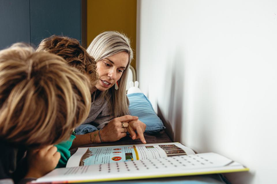 ‘De twee jongens zijn allebei heel sterk in technisch lezen, maar de oudste is ook een “echte lezer”. We moeten erop letten dat hij genoeg slaap krijgt, want hij zou blijven lezen. Vaak grijpt hij ook naar boeken die inhoudelijk uitdagender zijn dan wat er bij zijn leefwereld aansluit. Het is soms zoeken naar een evenwicht tussen wat hij technisch al kan en wat inhoudelijk lukt en past. Bij de jongste is het niet altijd gemakkelijk om iets te vinden wat hij leuk vindt. Ik reik hem heel veel aan, maar het pakt niet altijd.’