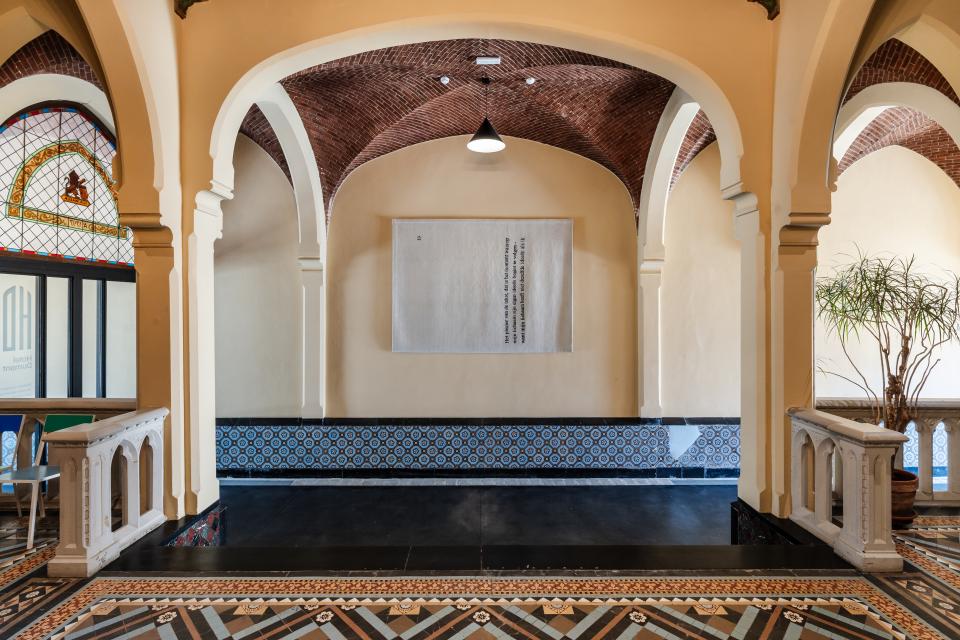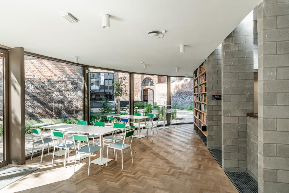 De binnentuin werd heraangelegd en opener gemaakt door het slopen van niet-kwalitatieve aanbouwen. In de vrijgekomen ruimte werd een gloednieuw paviljoen opgetrokken dat het binnengebied opent en activeert als literaire binnentuin. Naast de grote bibliotheekcollectie zijn er ook vergaderruimtes en een lunchplek voor de medewerkers.